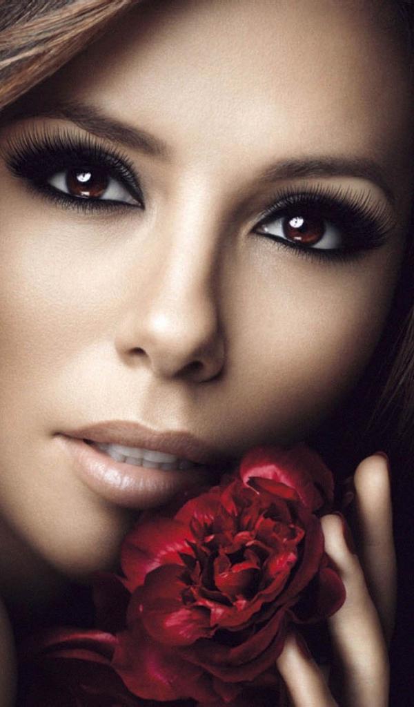 Wallpaper Beautiful brown-eyed actress Eva Longoria with a red flower