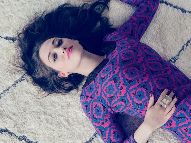 Wallpaper Actress Kat Dennings lies on the carpet in a beautiful dress
