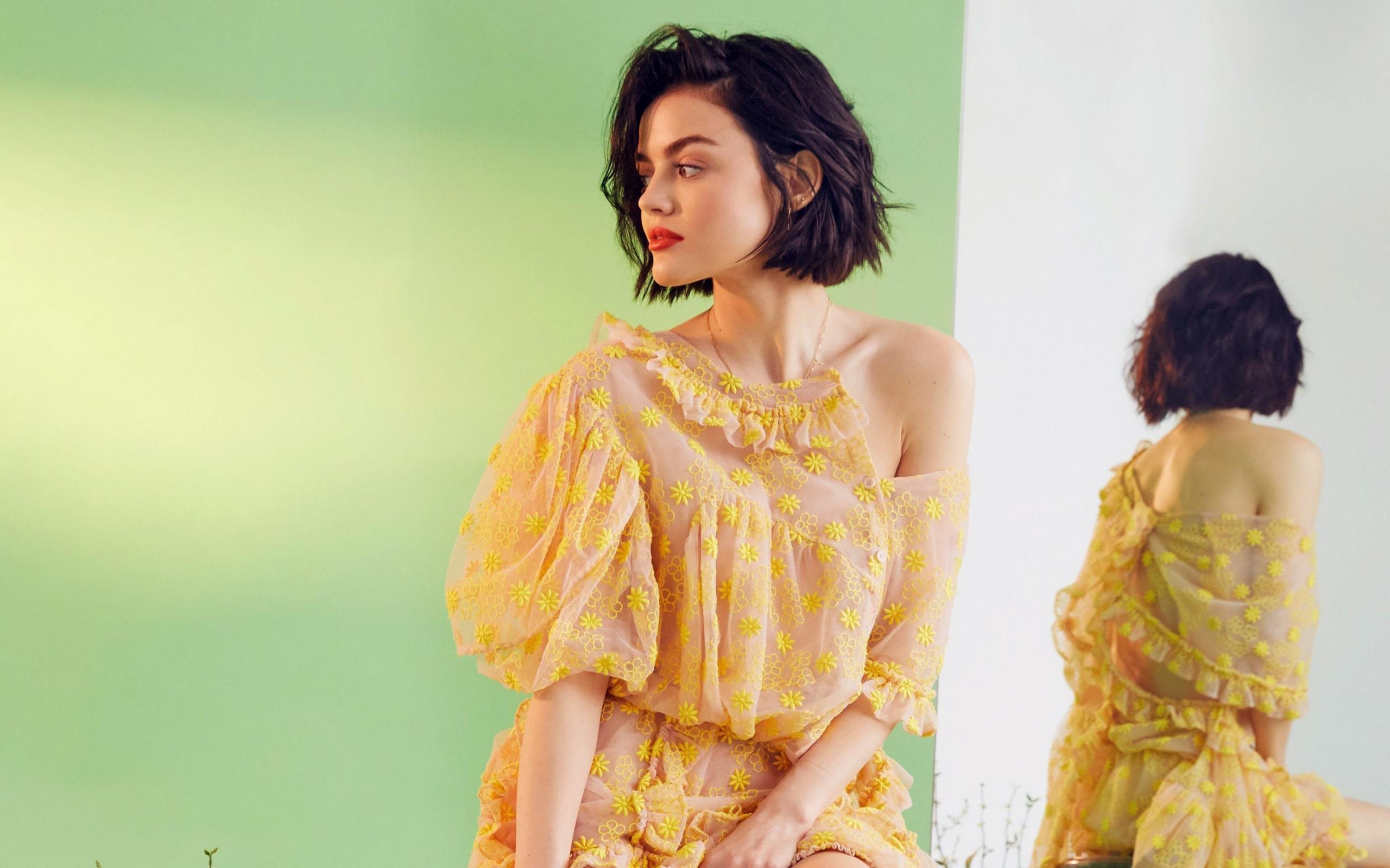 Wallpaper Young actress Lucy Hale in a beautiful dress is reflected in a mirror
