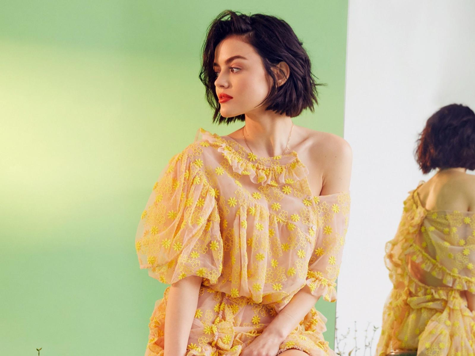 Wallpaper Young actress Lucy Hale in a beautiful dress is reflected in a mirror