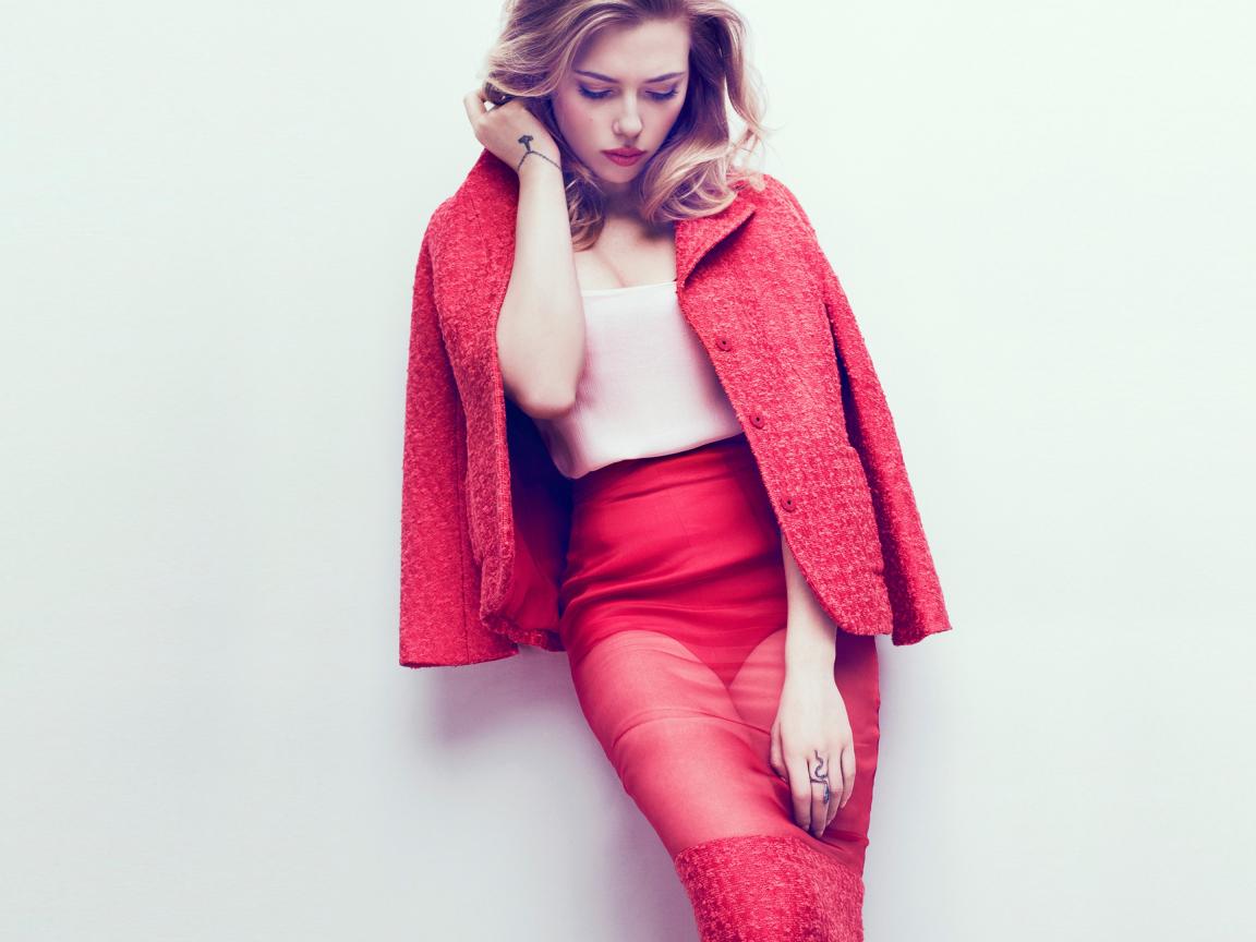 Wallpaper Effective blonde Scarlett Johansson in a red suit