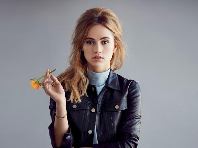 Wallpaper Actress Sookie Waterhouse with a flower in her hands on a gray background