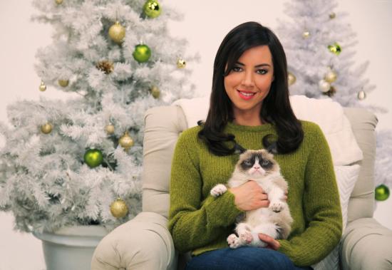 Wallpaper Actress Aubrey Plasa with a cat at a New Year tree