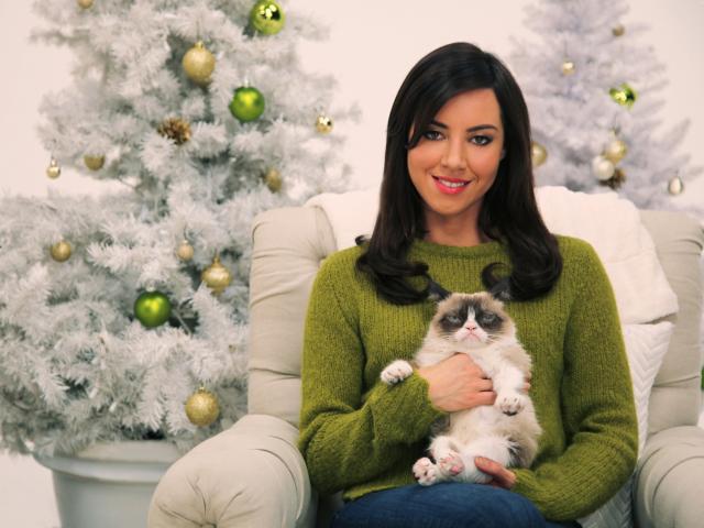 Wallpaper Actress Aubrey Plasa with a cat at a New Year tree