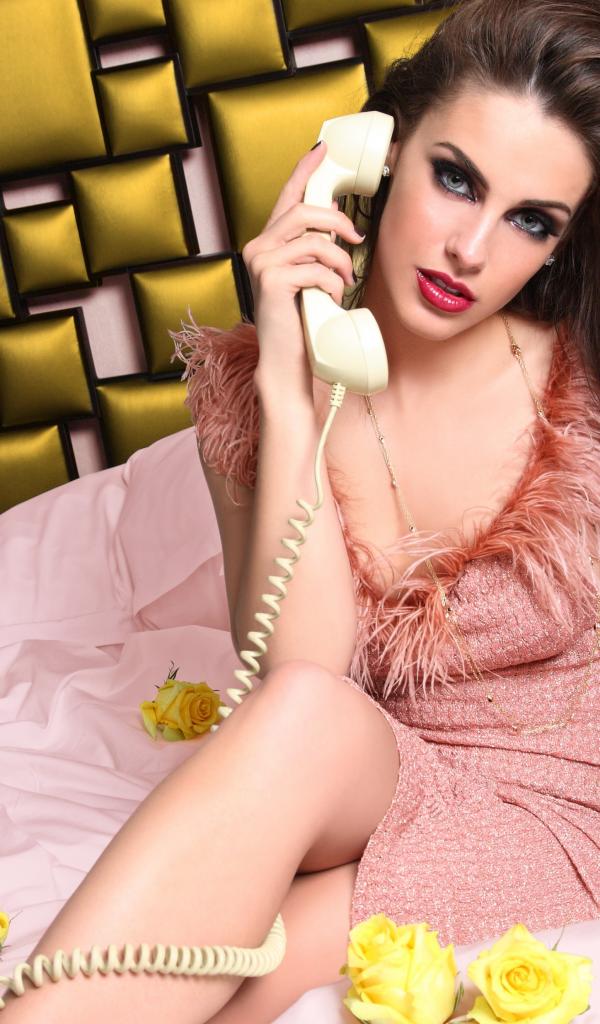 Wallpaper Spectacular Canadian actress, singer Jessica Loundes with a phone on the bed