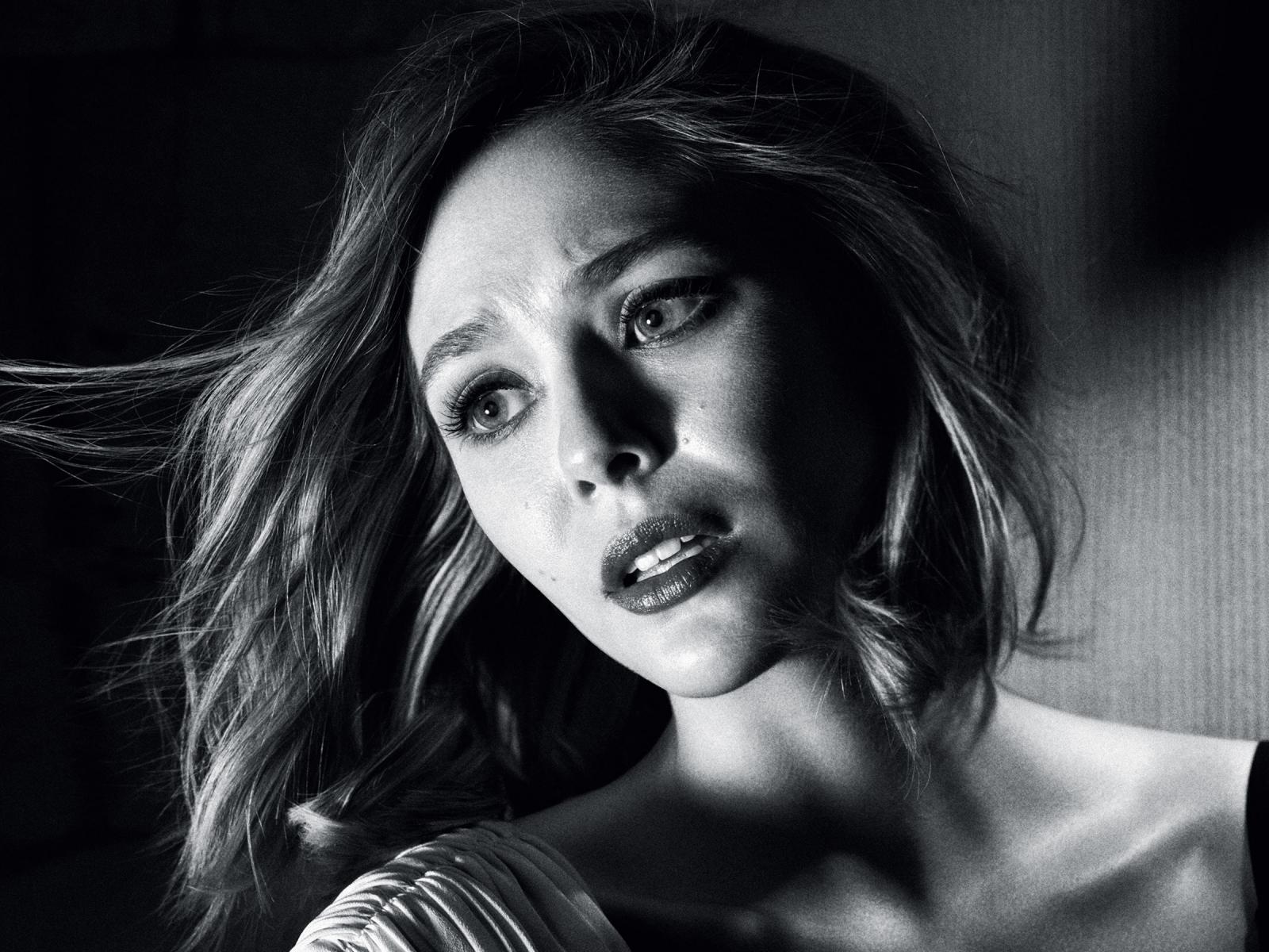 Wallpaper Actress Elizabeth Olsen in black and white photo