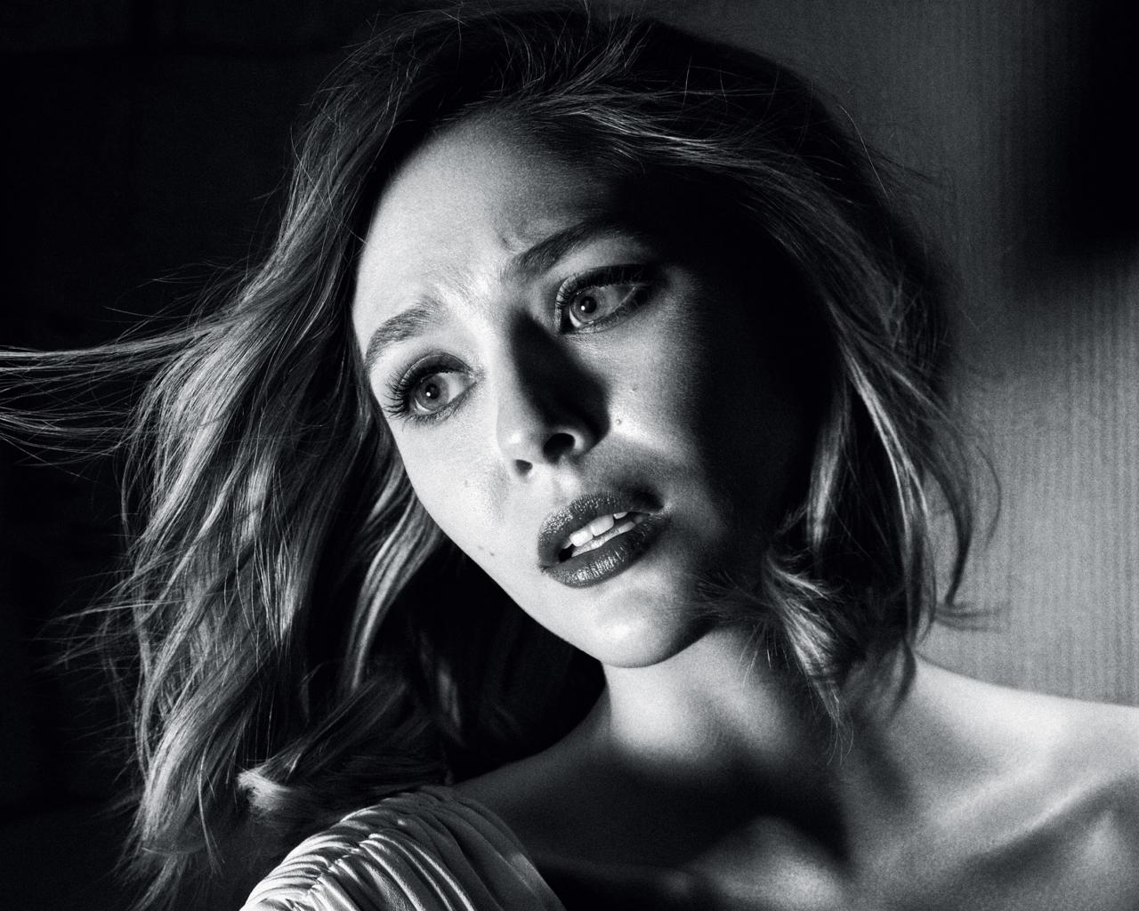 Wallpaper Actress Elizabeth Olsen in black and white photo
