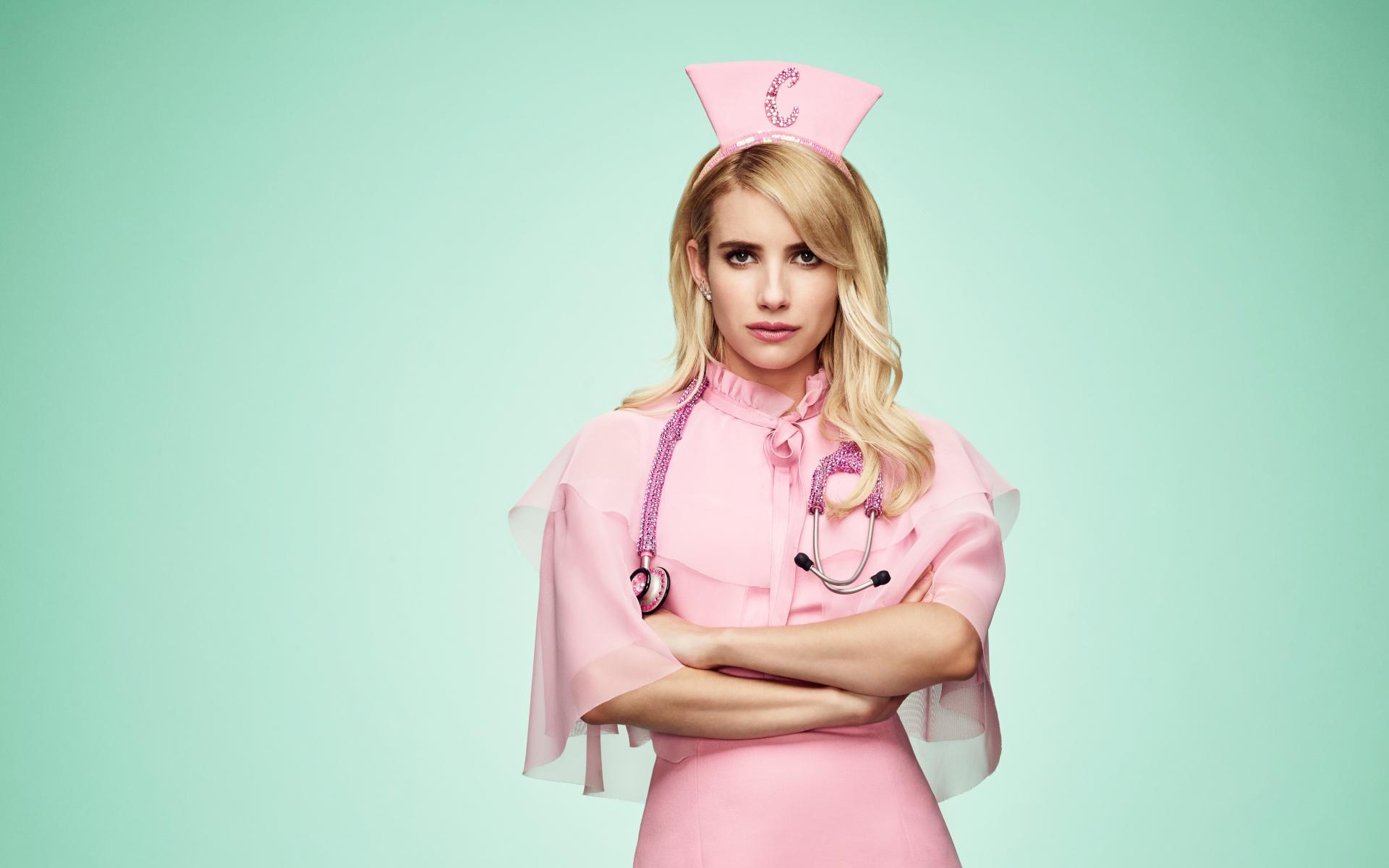 Wallpaper Young actress Emma Roberts in a pink suit of a nurse