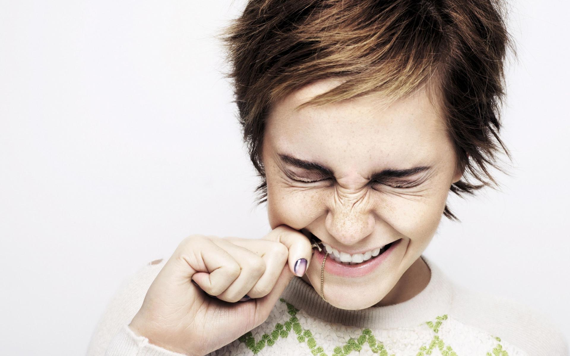 Wallpaper Laughing actress Emma Watson with a short haircut