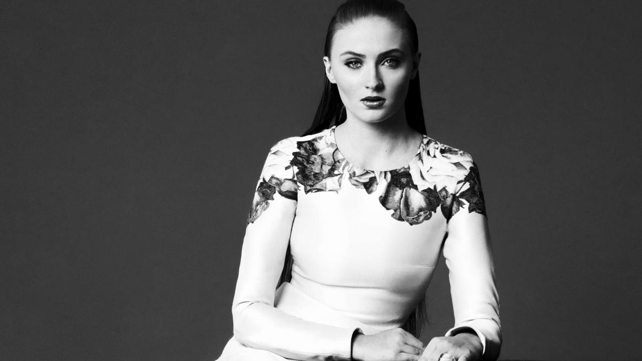 Wallpaper Actress Sophie Turner in a beautiful dress, black and white photo