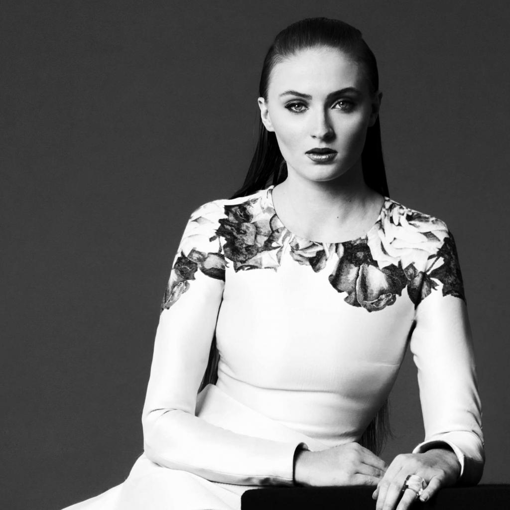 Wallpaper Actress Sophie Turner in a beautiful dress, black and white photo