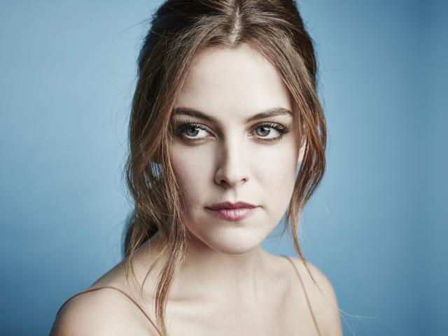 Wallpaper Beautiful actress Riley Kio photo on a blue background