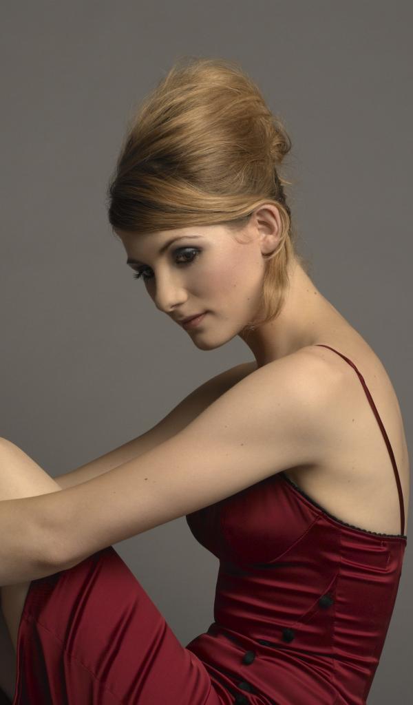 Wallpaper English actress Jody Whittaker in a red dress on a gray background