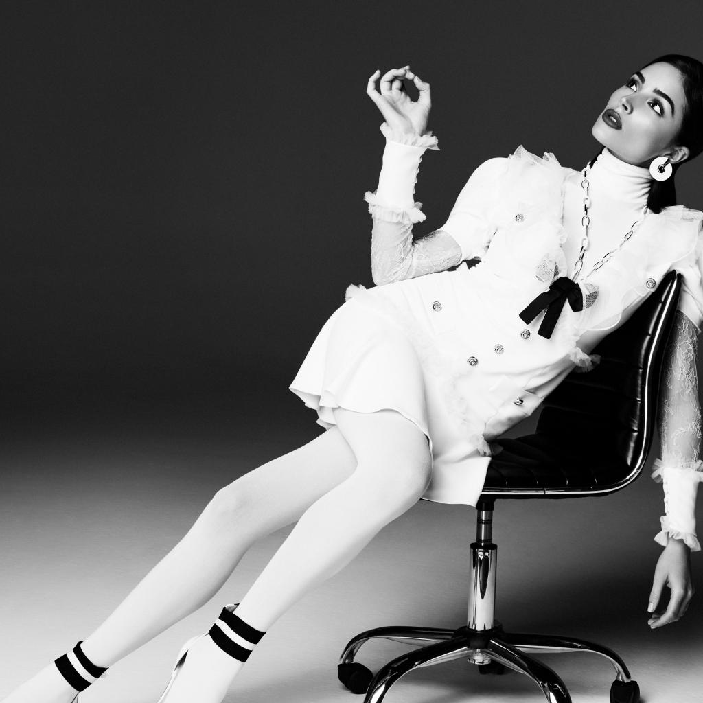 Wallpaper American actress Olivia Calpo sits in a chair, black and white photo