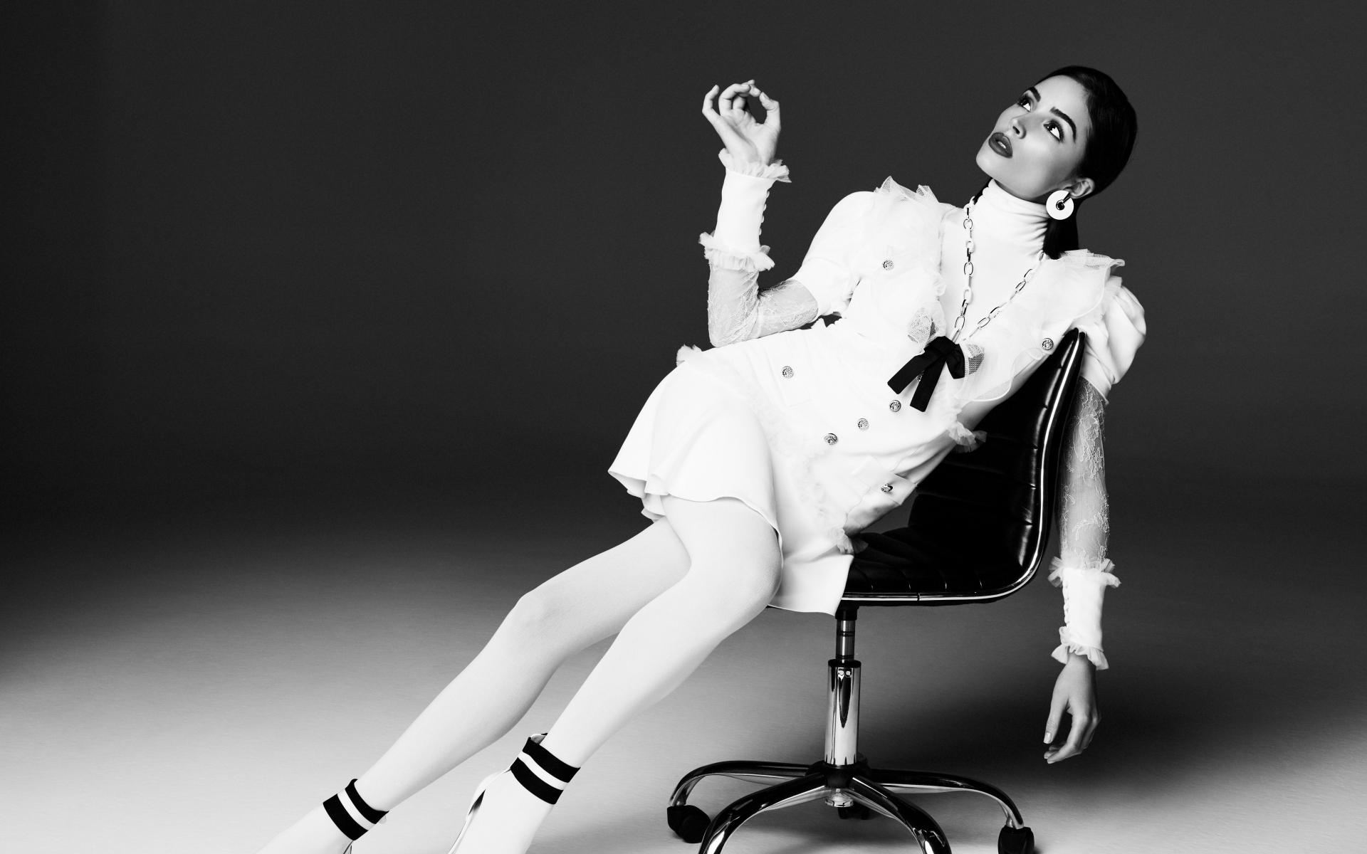 Wallpaper American actress Olivia Calpo sits in a chair, black and white photo