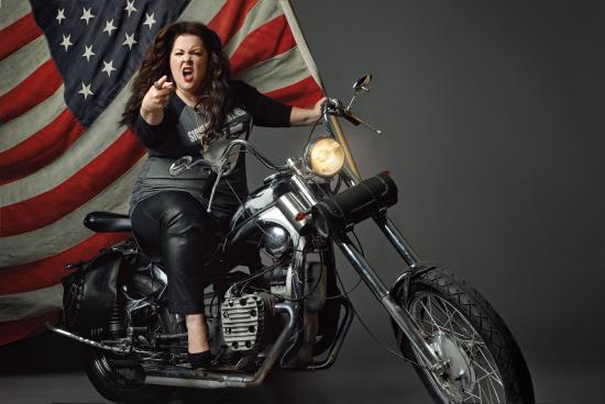 Wallpaper Popular actress Melissa McCarthy on a motorcycle with a flag