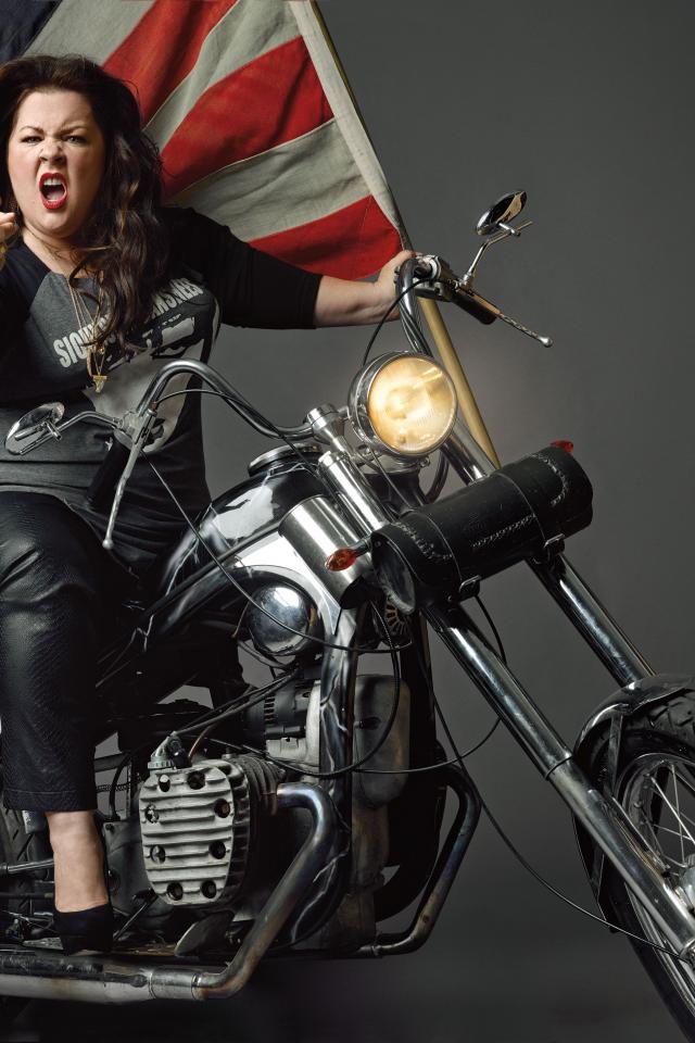 Wallpaper Popular actress Melissa McCarthy on a motorcycle with a flag