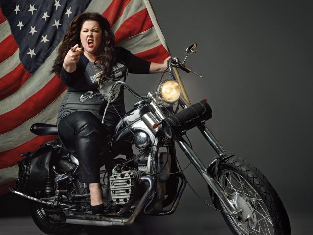 Wallpaper Popular actress Melissa McCarthy on a motorcycle with a flag