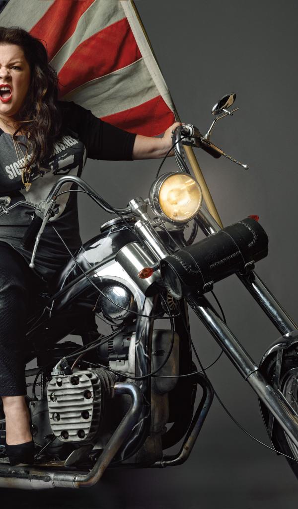 Wallpaper Popular actress Melissa McCarthy on a motorcycle with a flag