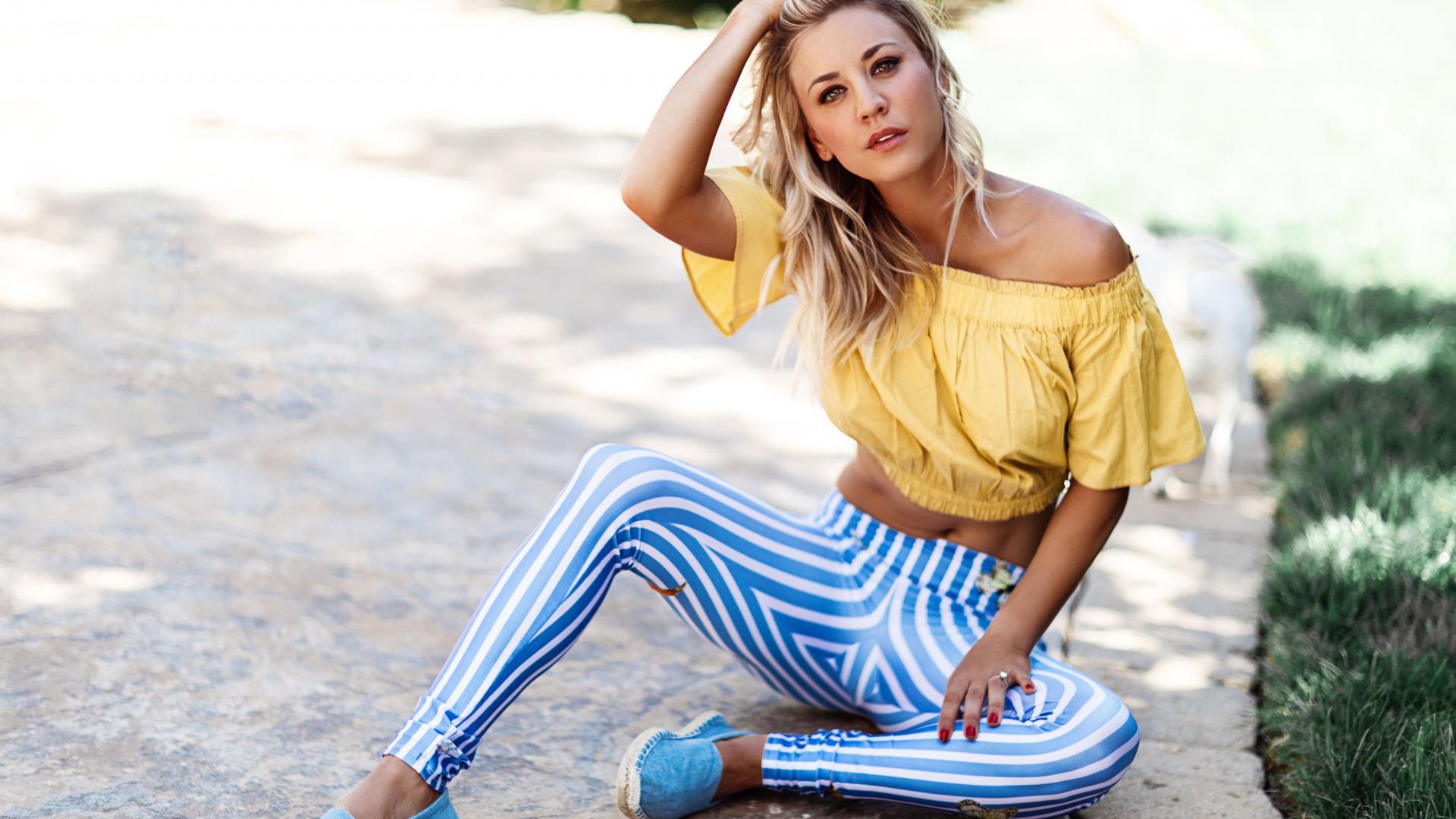 Wallpaper Beautiful blonde in striped pants, actress Kaley Cuoco