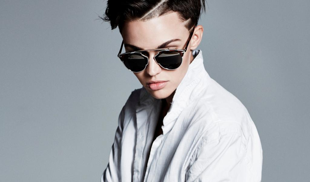 Wallpaper Actress Ruby Rose in a white shirt and glasses on a gray background