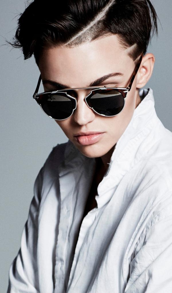 Wallpaper Actress Ruby Rose in a white shirt and glasses on a gray background
