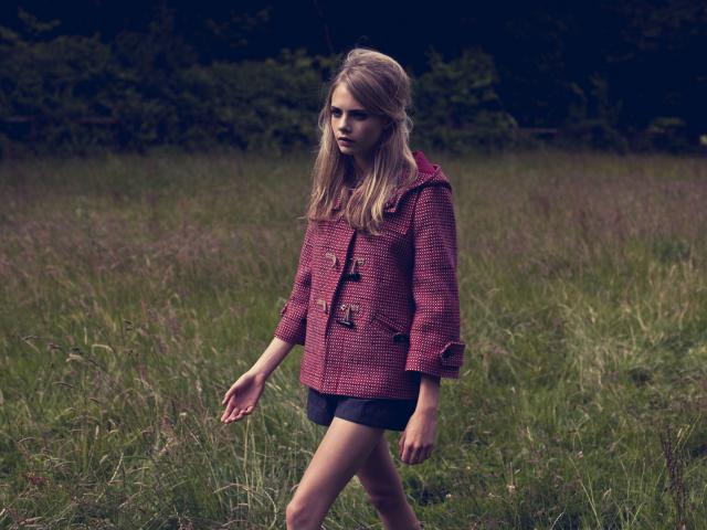 Wallpaper Actress Cara Delevingne walking through the grass in a coat