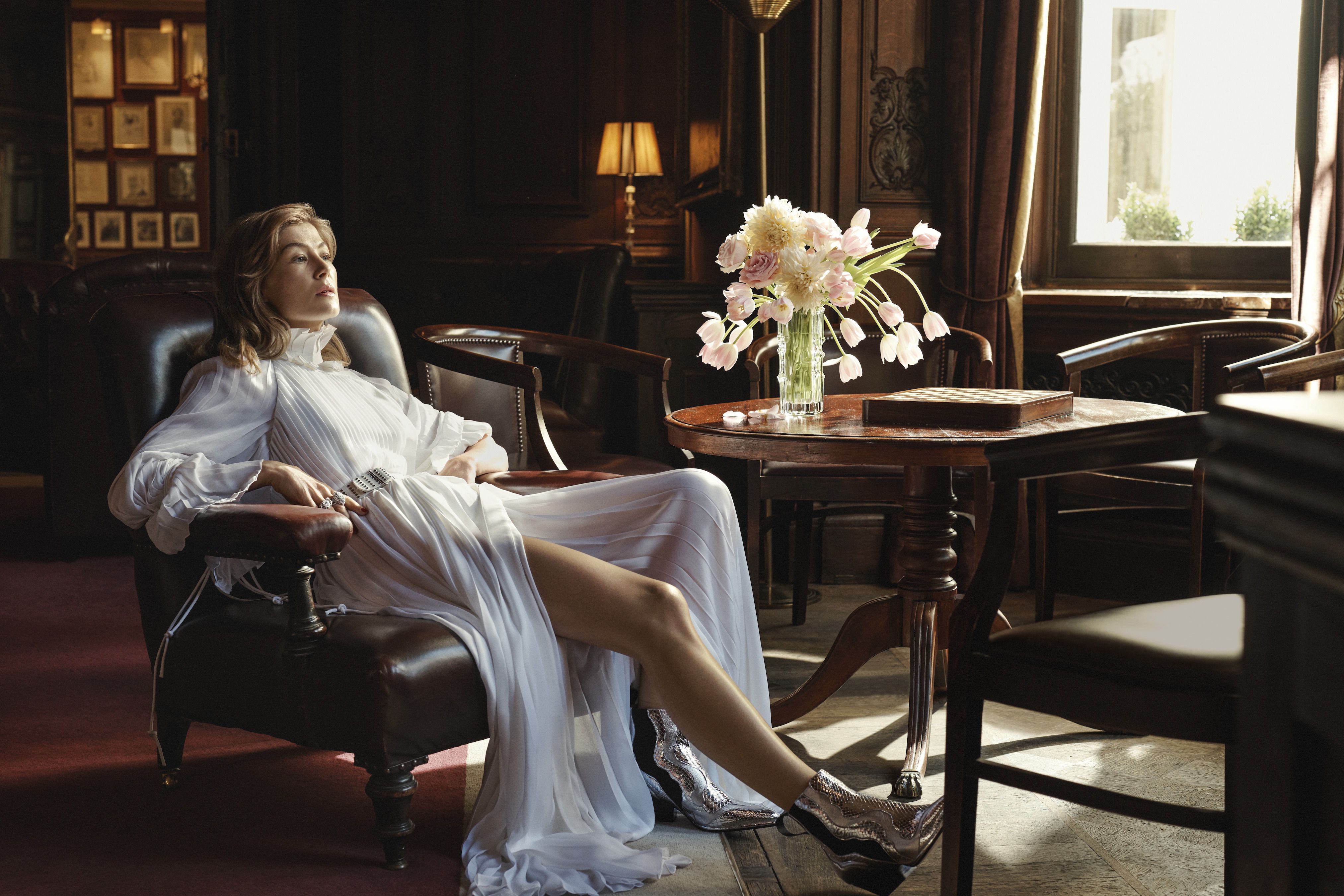 Wallpaper Actress Rosamund Pike in a white dress in a chair