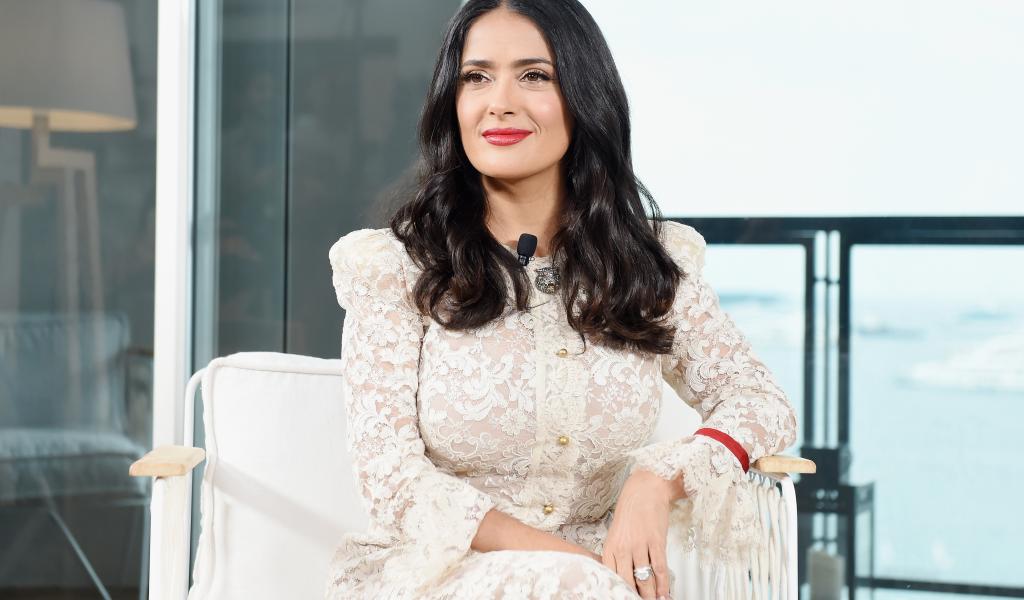 Wallpaper Beautiful actress Salma Hayek in a white dress in the chair
