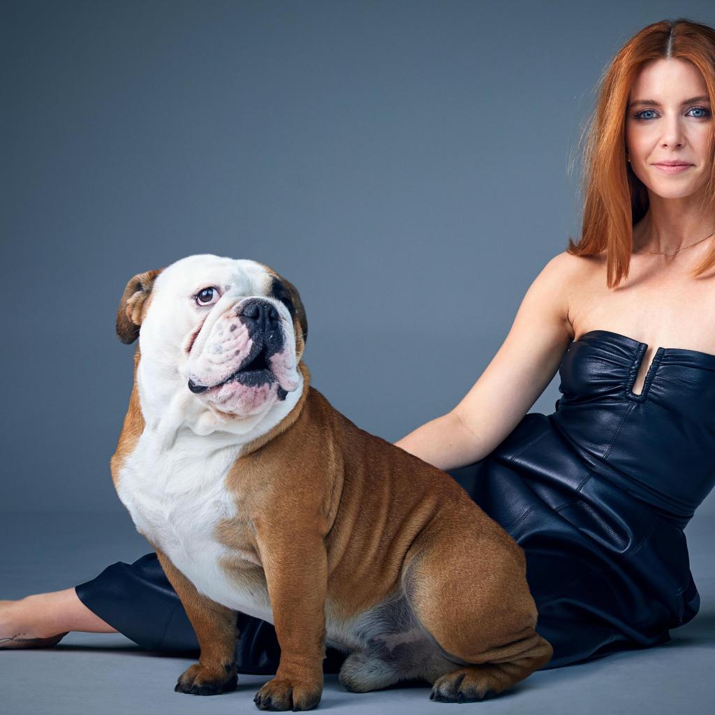 Wallpaper TV presenter Stacy Dooley with a bulldog on a gray background