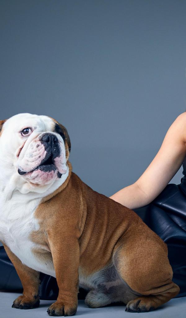 Wallpaper TV presenter Stacy Dooley with a bulldog on a gray background