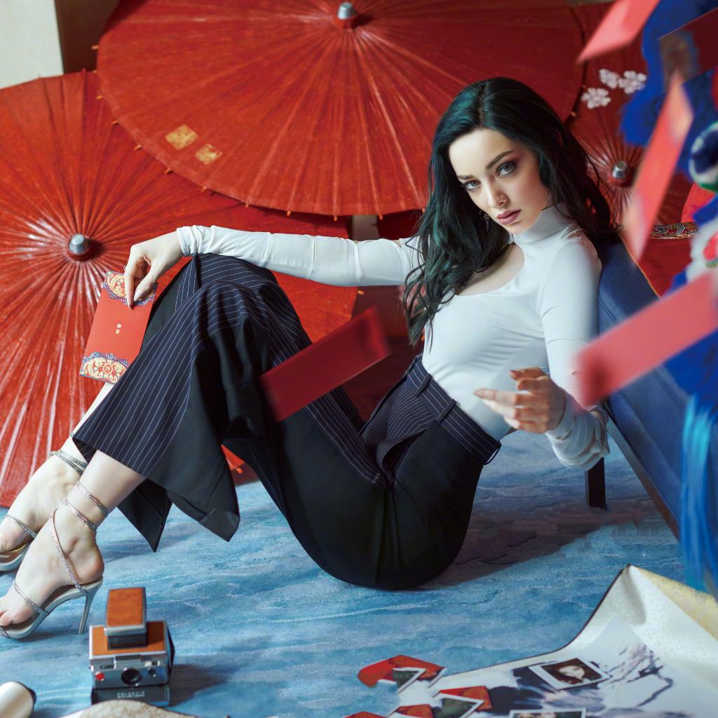 Wallpaper Young American actress Emma Dumont on the floor with umbrellas