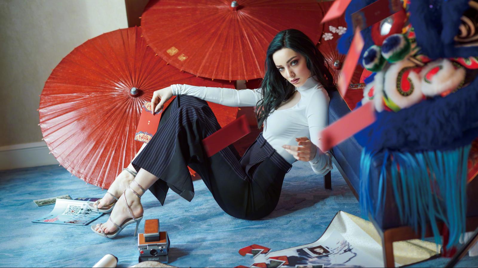 Wallpaper Young American actress Emma Dumont on the floor with umbrellas