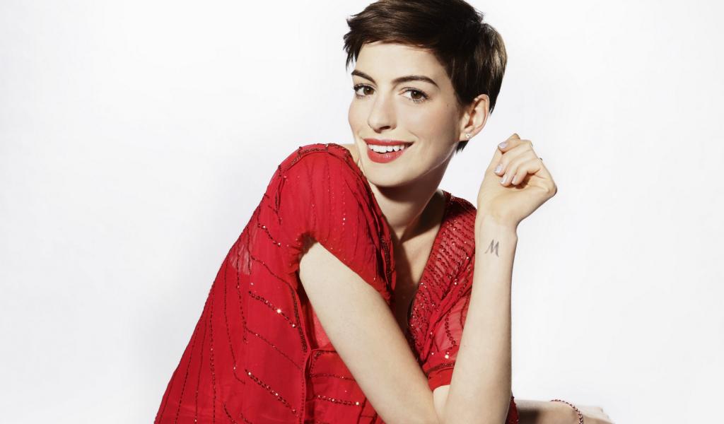 Wallpaper Actress Anne Hathaway in red dress with a short haircut
