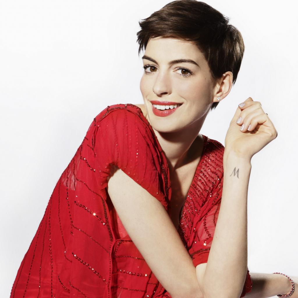 Wallpaper Actress Anne Hathaway in red dress with a short haircut