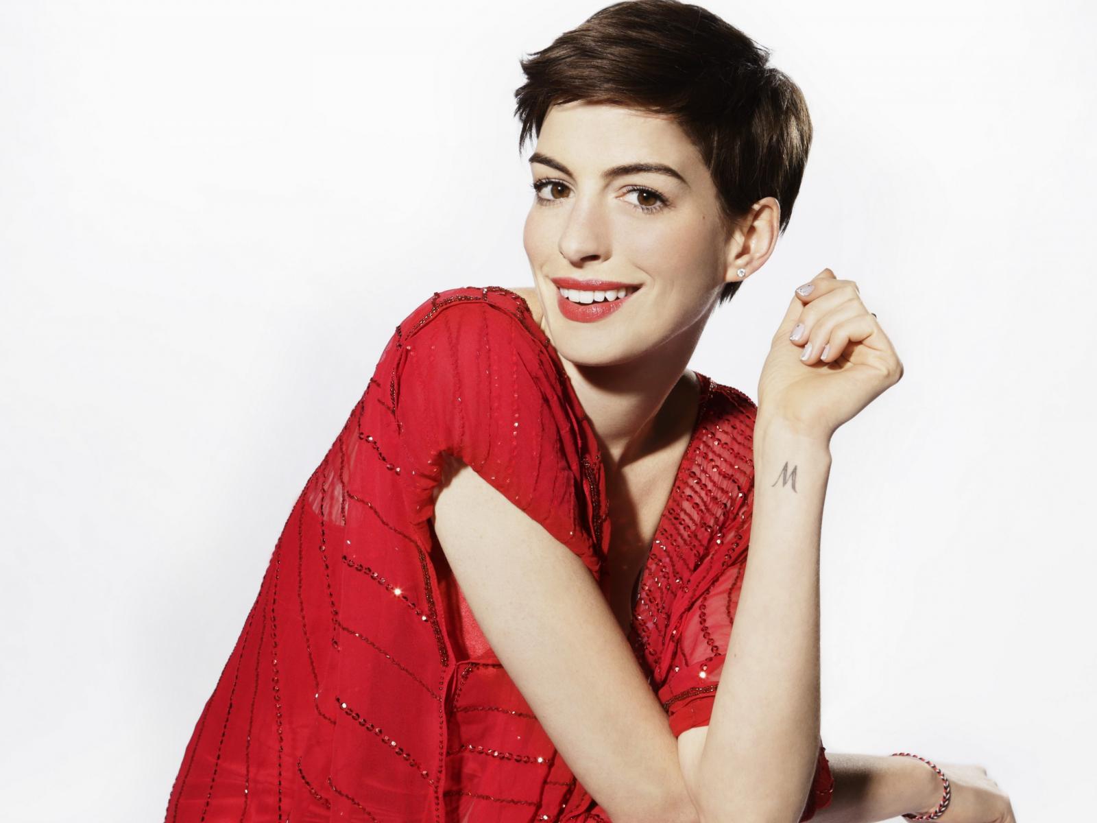 Wallpaper Actress Anne Hathaway in red dress with a short haircut