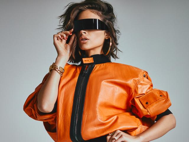 Wallpaper Fashionable actress Olivia Calpo in a leather jacket on a gray background