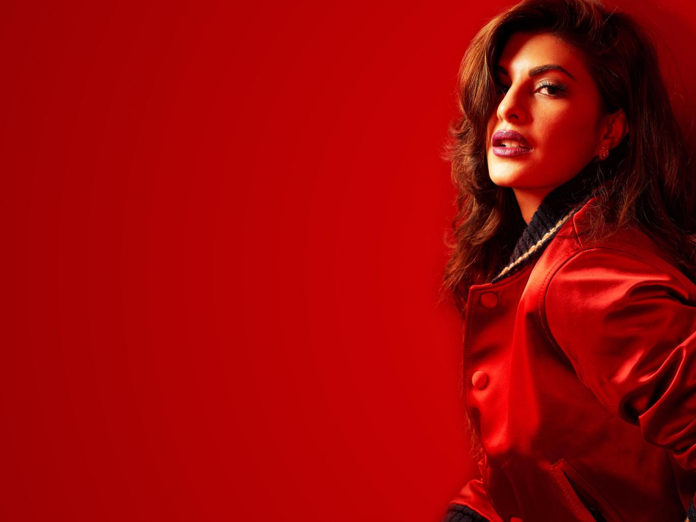 Wallpaper Actress Jacqueline Fernandez on a red background