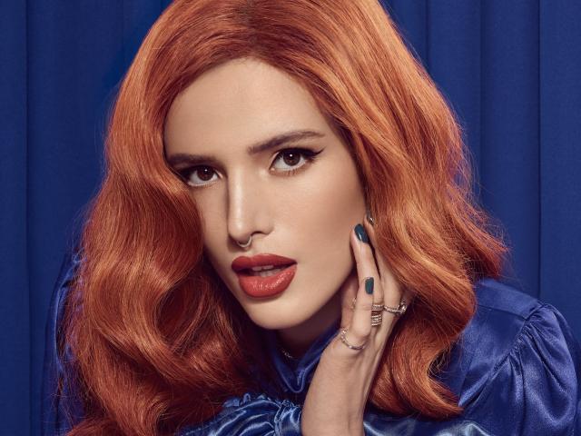 Wallpaper Red-haired actress Bella Thorn on a blue background