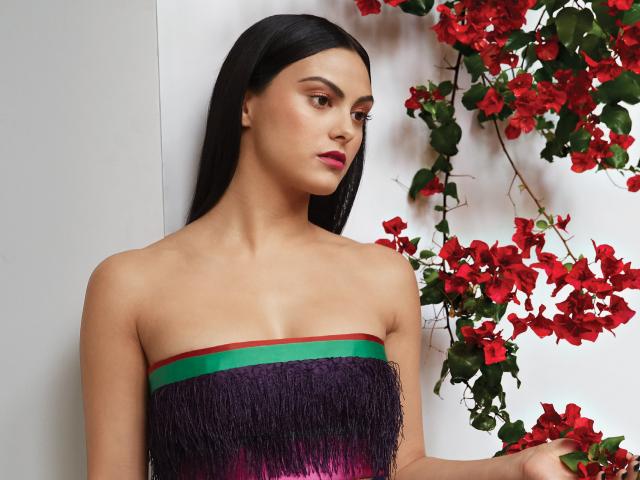 Wallpaper Actress Camila Mendes stands against a wall with flowers