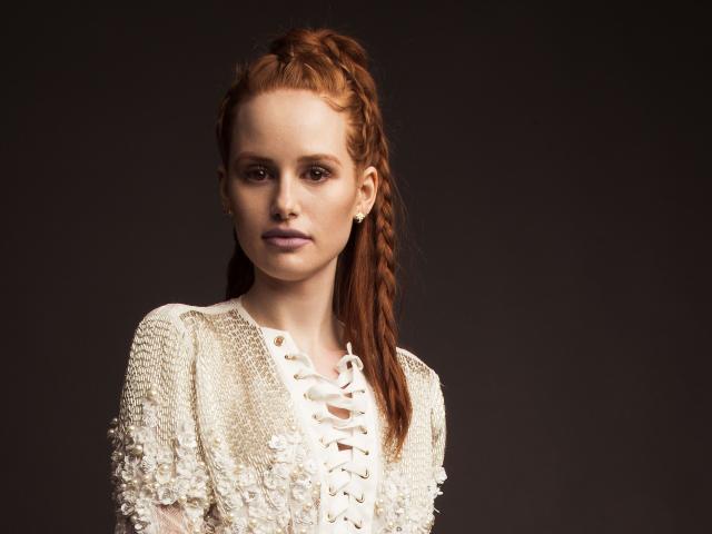 Wallpaper Red-haired actress Madeline Petsh in a white dress on a gray background