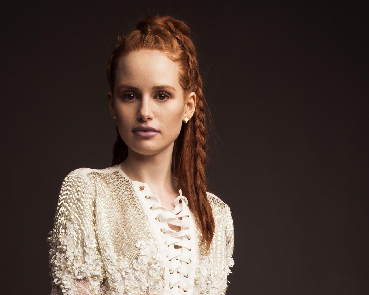 Wallpaper Red-haired actress Madeline Petsh in a white dress on a gray background