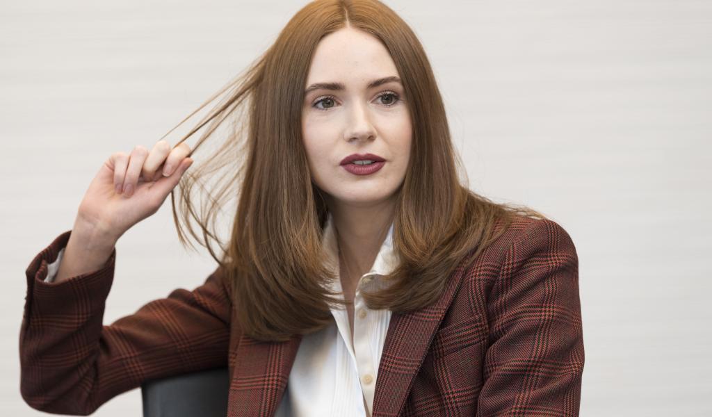 Wallpaper Actress Karen Gillan in a jacket holds hair