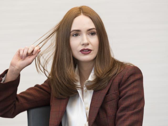 Wallpaper Actress Karen Gillan in a jacket holds hair