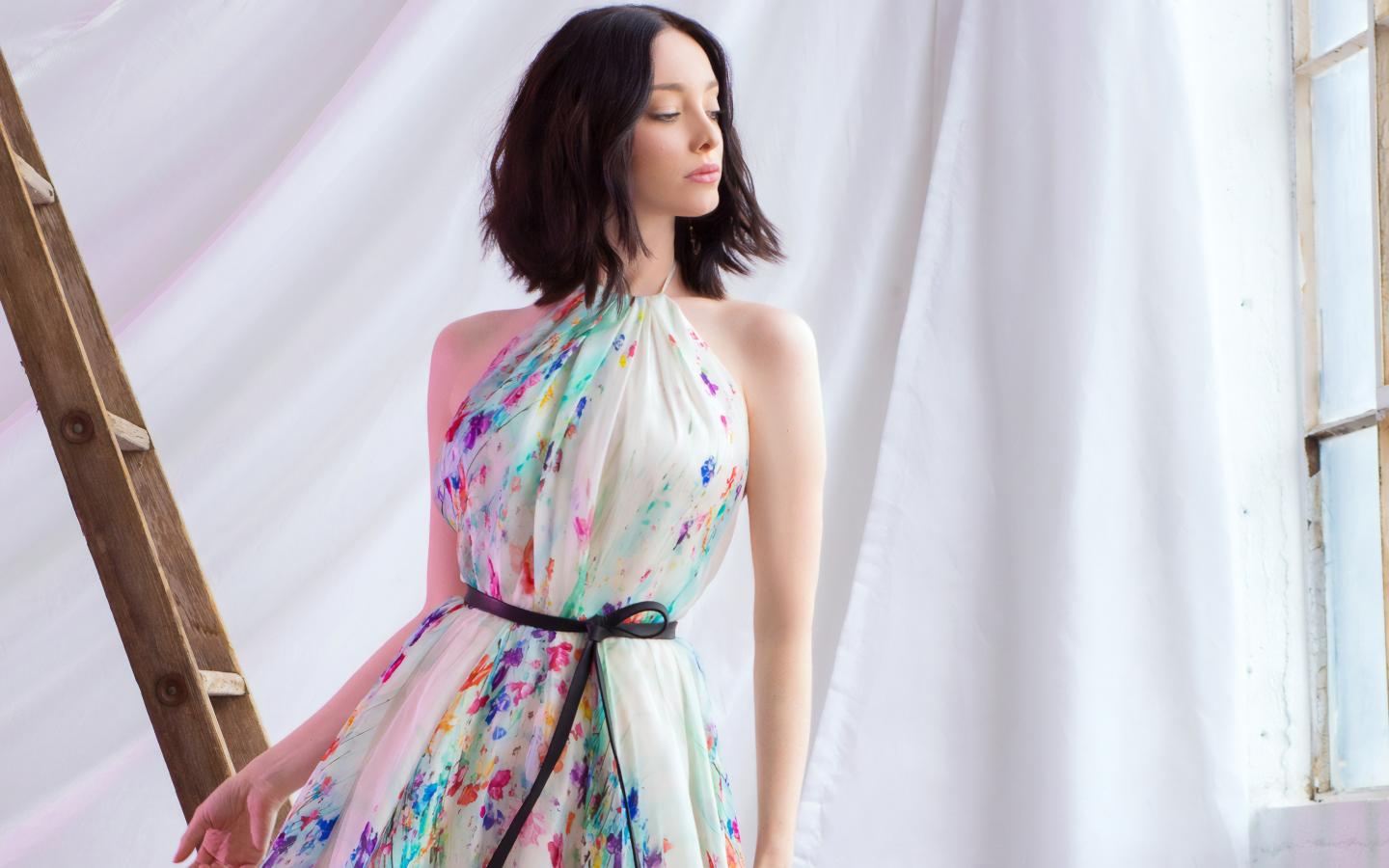 Wallpaper Actress Emma Dumont in a beautiful dress by the window