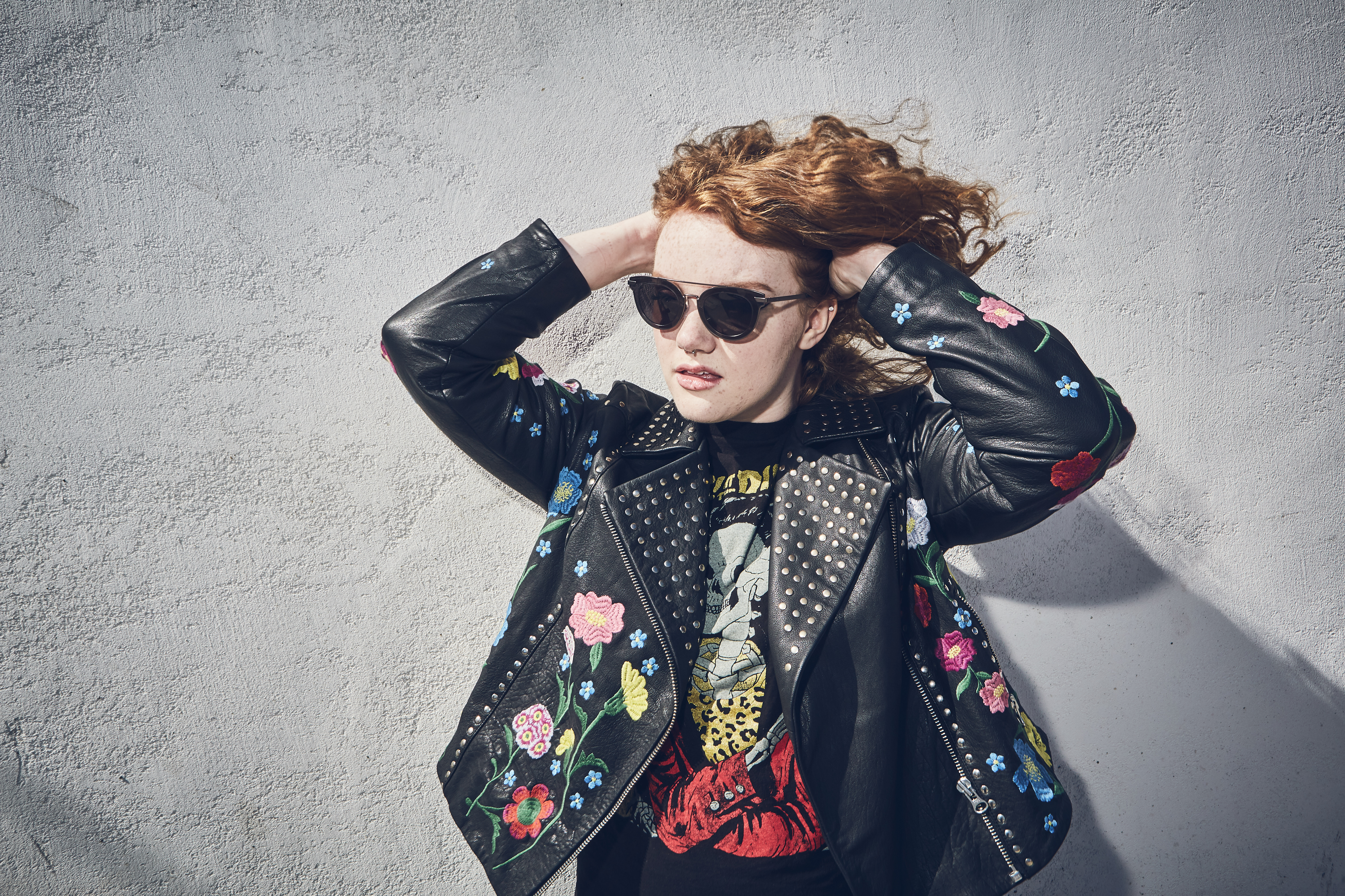 Wallpaper Actress Shannon Purser in a leather jacket against the wall