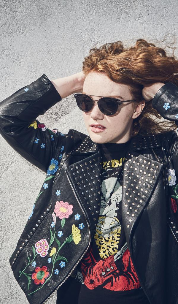 Wallpaper Actress Shannon Purser in a leather jacket against the wall