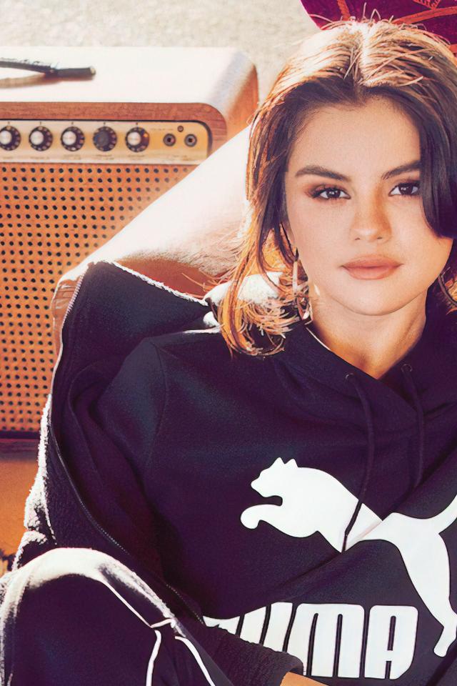 Wallpaper Actress Selena Gomez in a tracksuit sits on the floor by the sofa