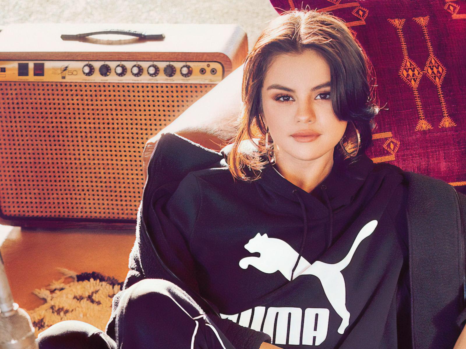 Wallpaper Actress Selena Gomez in a tracksuit sits on the floor by the sofa