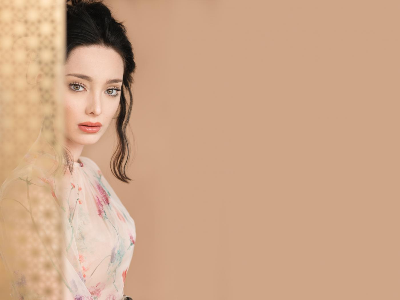 Wallpaper Beautiful woman, actress Emma Dumont behind the curtain